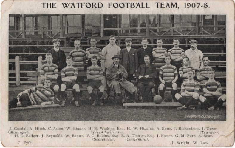 Then, in 1906, Watford’s manager John Goodall, signed him. He’s in the 1907/8 team photo here (seated, far left, in front of the manager).