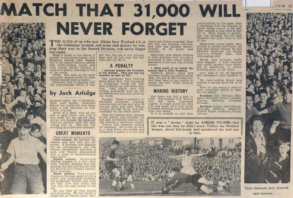 The Wednesday night at the Goldstone Ground is one that’s still fondly remembered by Brighton fans. They won promotion to the Second Division with a 6-0 victory. Remarkably, Brighton were 3-0 up after just 11 minutes, with a hat-trick from a young reserve-team striker in only his 7th game. He went on to score five. Anecdotal evidence suggests he was being marked by Johnny Meadows.